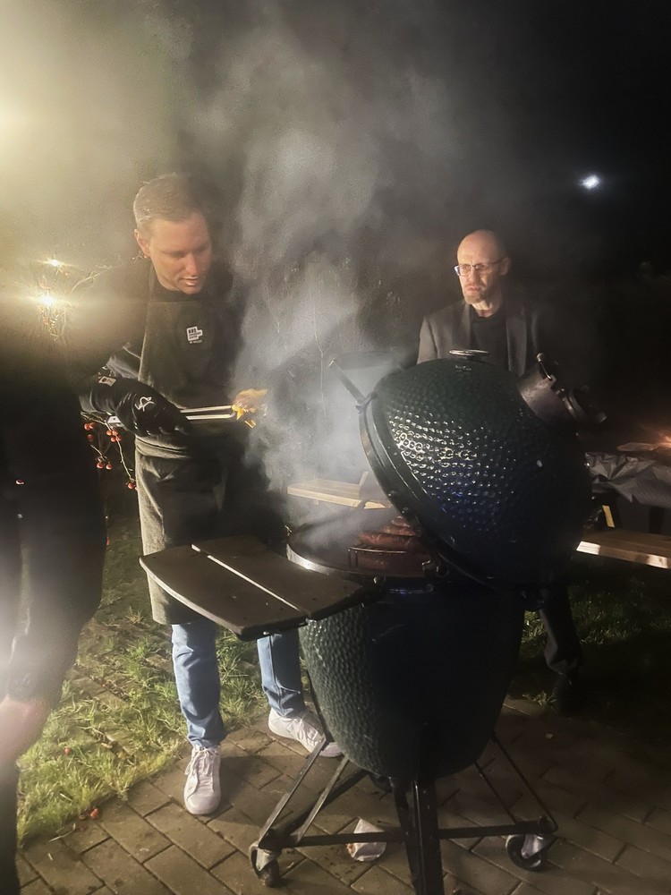 Na al dat verbaasd “hoe-doet-hij-dat-gedoe” was het tijd voor iets anders waar we naar uitkeken: eten. En niet zomaar eten. Onze eigen Stijn — in de wandelgangen beter bekend als de man die zelfs in november nog achter zijn barbecue staat — had zijn grillkunsten bovengehaald. Hamburgers, braadworsten en zijn zelfbereide pulled pork werden met smaak gegeten.