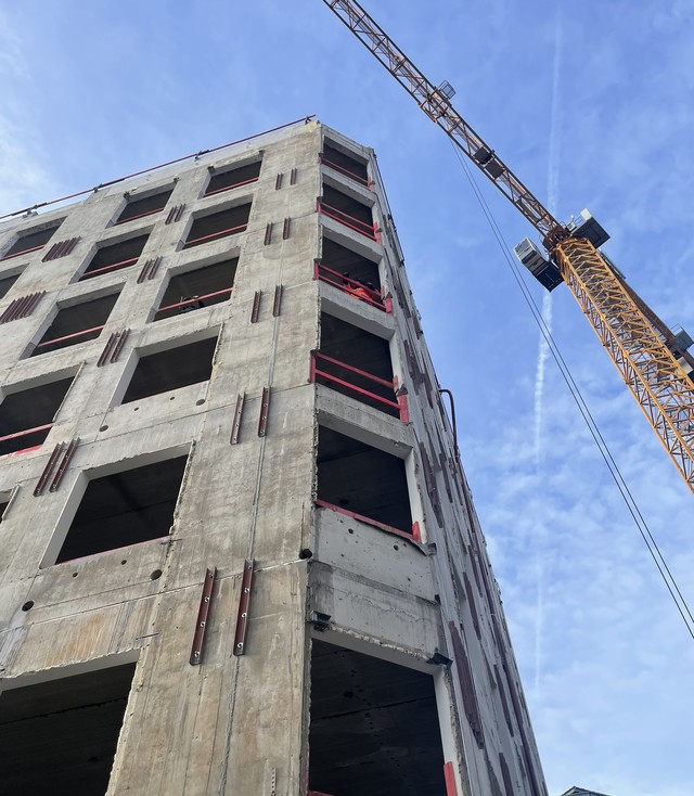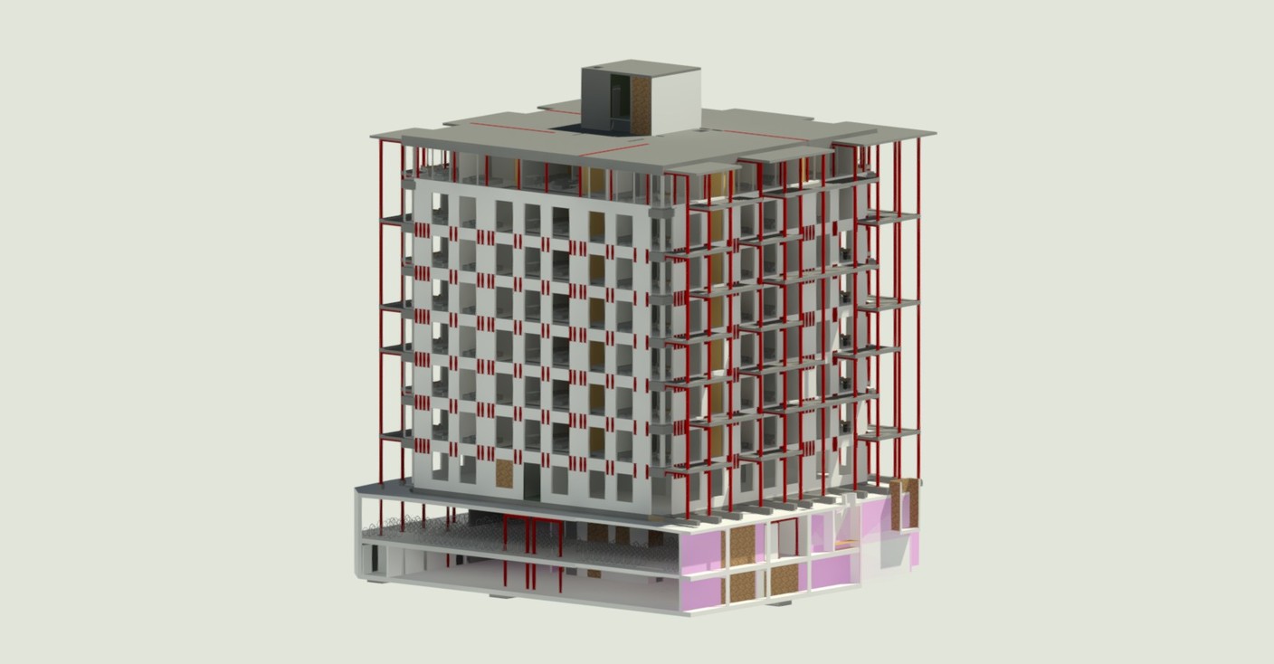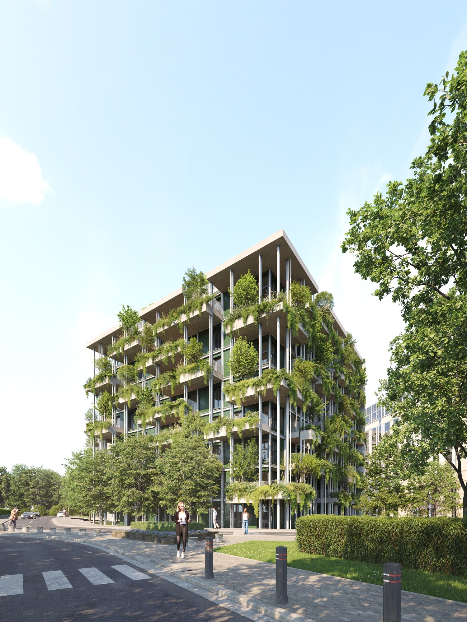 Het bestaande kantoorgebouw wordt volledig getransformeerd tot woonappartementen. De trappenkern ondergaat een grondige verbouwing om verschillende woonfuncties te kunnen opnemen. Nieuwe gevelopeningen zorgen voor toegang tot de buitenterrassen, die worden gedragen door een staalskelet dat op zijn beurt steunt op een structuur van kolommen en liggers in de parkeerkelder.