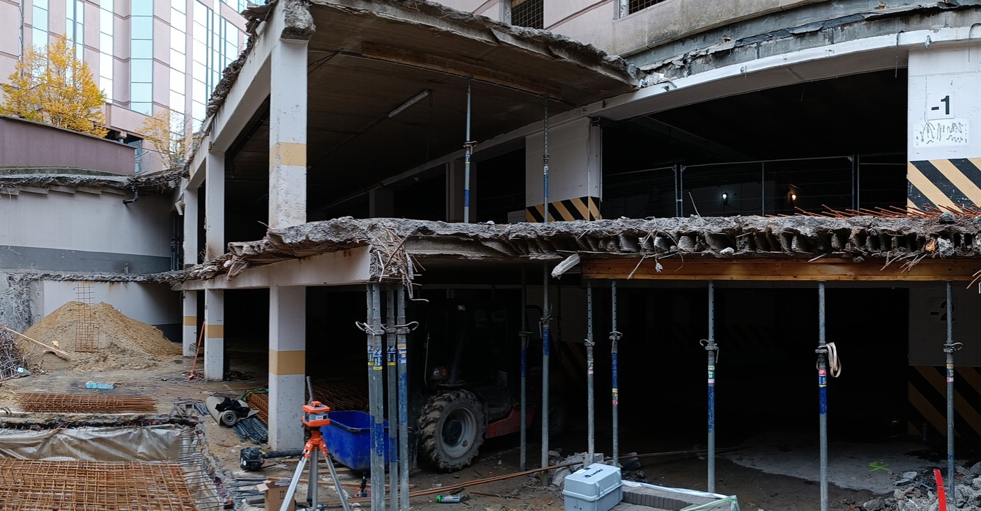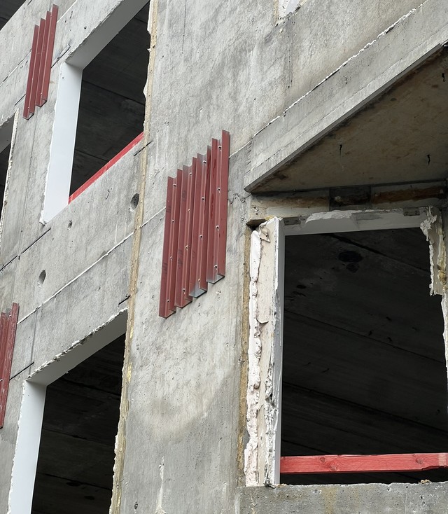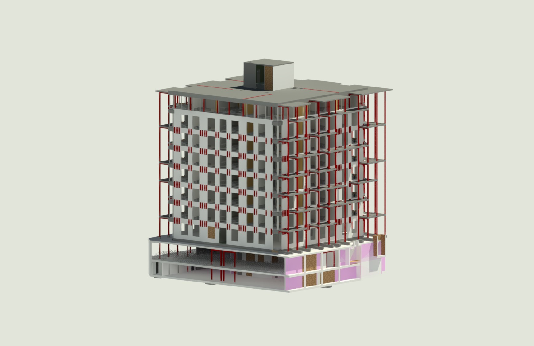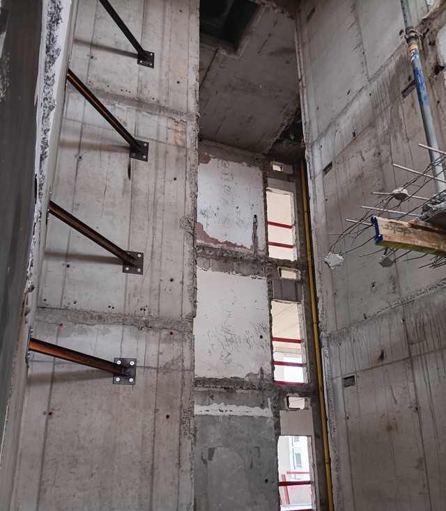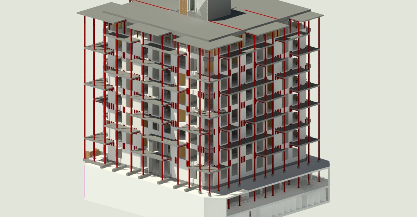 Het bestaande kantoorgebouw wordt volledig getransformeerd tot woonappartementen. De trappenkern ondergaat een grondige verbouwing om verschillende woonfuncties te kunnen opnemen. Nieuwe gevelopeningen zorgen voor toegang tot de buitenterrassen, die worden gedragen door een staalskelet dat op zijn beurt steunt op een structuur van kolommen en liggers in de parkeerkelder.